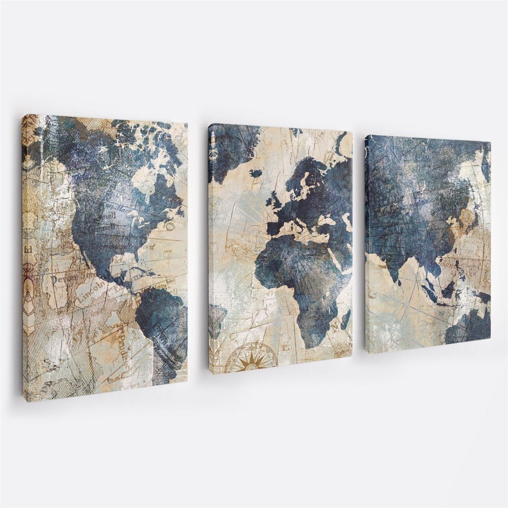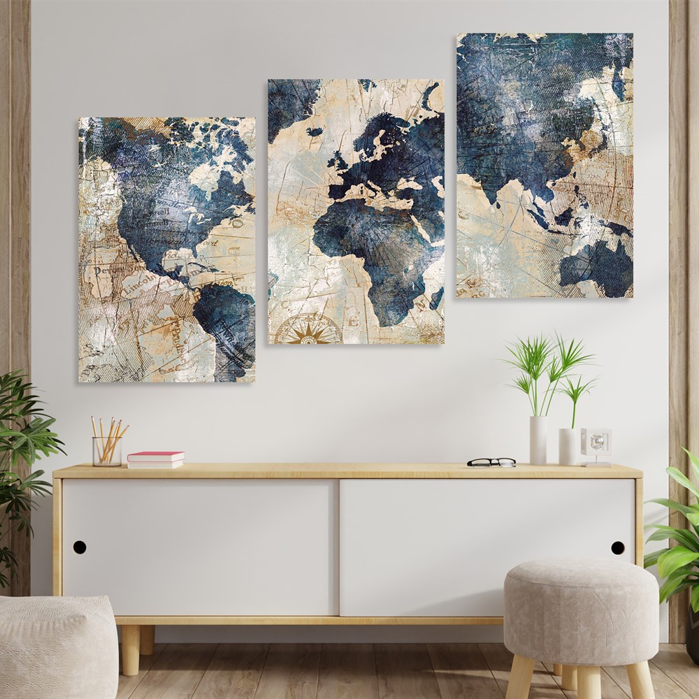 Eskimiş Desenli Dünya Haritası 3'lü Duvar Tablo Seti