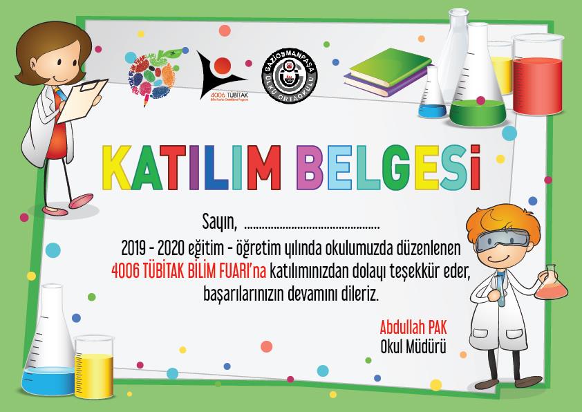 •          Bilim Fuarı etkinliklerine katılanlara verilmek üzere hazırlanmış katılım belgesi.